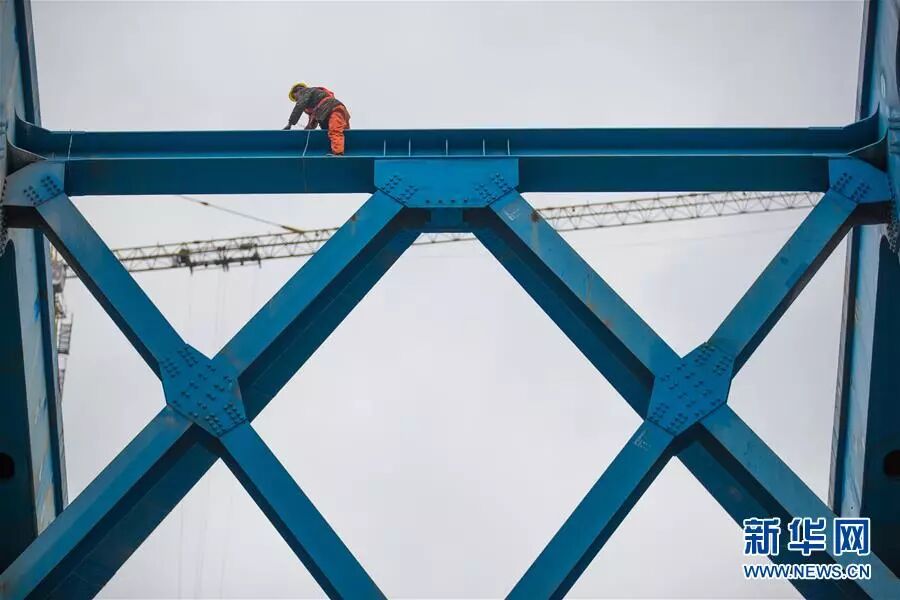 3月14日,施工人员在鸭池河特大桥上拆除辅助设施。新华社记者 刘续摄