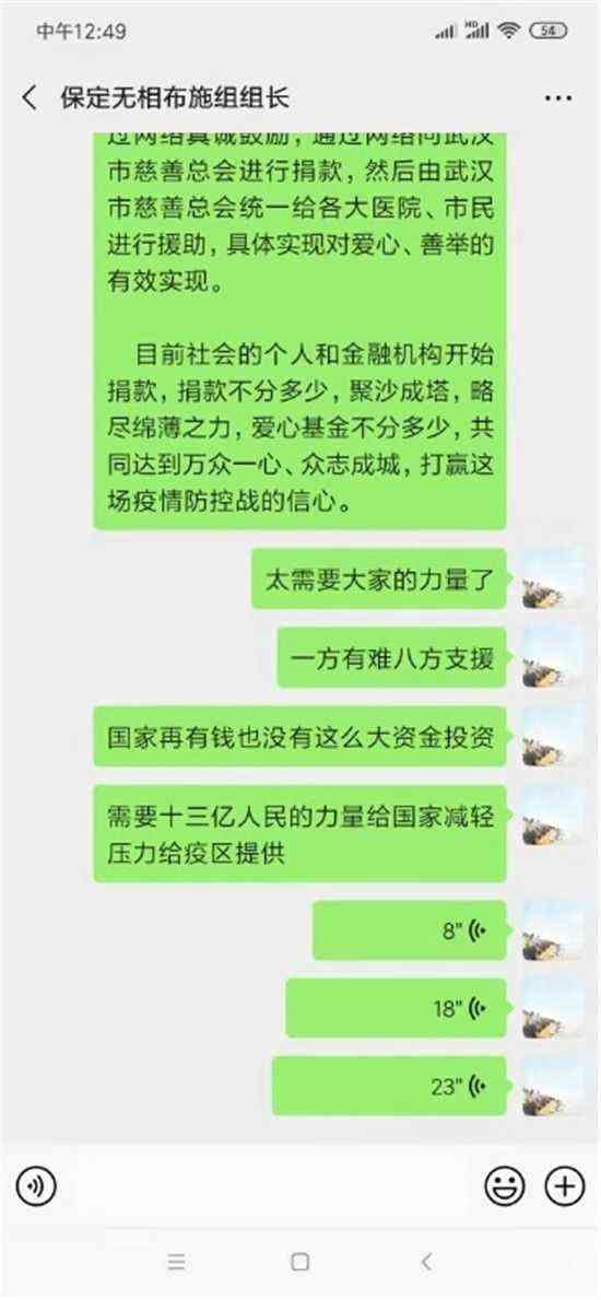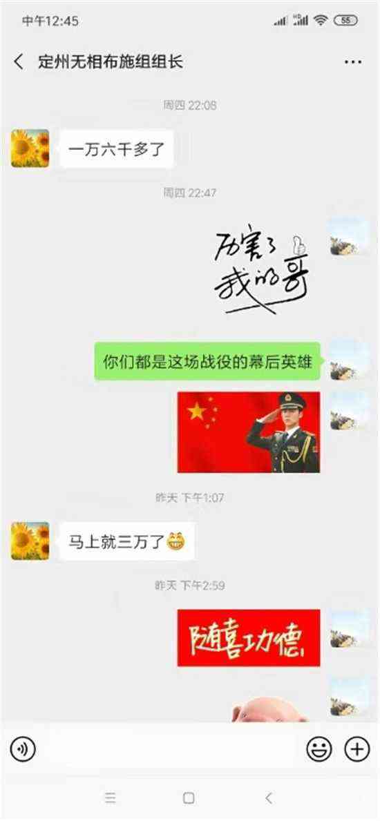 看到李娜所长的呼吁后,保定无相布施组、定州无相布施组等一些爱心人士纷纷加入了捐款献爱心的队伍。家住定州市的一位年逾八旬的老者从退休金中拿出一万元进行捐助。值得一提的是,这位老者几十年如一日,每月都要拿出五百元做好事。