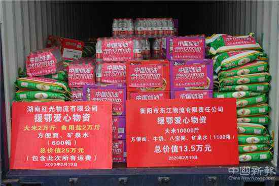 缺的生活物资,共计有大米3万斤、食用盐2万斤、白萝卜4万斤、有机生态红薯2.4万斤、方便面700箱、矿泉水600件、八宝粥200件、纯牛奶200件等价值57万元的物资(含运费)。所有捐赠物资全部由四个火车车皮集装箱装运,19日12:00从衡阳南站发车至黄州火车站,接收单位为黄州区红十字会。