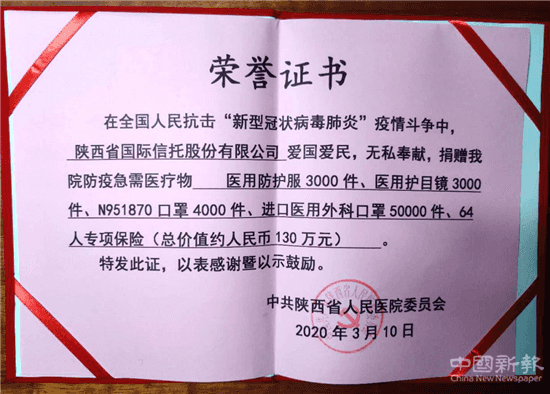据悉,近日陕国投抗疫慈善信托还向其他省内定点医院捐赠了大批医疗物资。3月9日,抗疫慈善信托向西京医院捐赠价值22万元的医用防护服890件,护目镜1000个;3月10日下午,由陕国投副总裁孙若鹏带队分别向西安交通大学第一、第二附属医院捐赠1500套医用防护服、1000个护目镜、2000个N95型口罩,总价值95.3万元。下一步,陕国投将继续通过慈善信托服务于陕西省、湖北省抗疫定点、重点治疗医院、医护人员和患者救助工作,积极助力全面打赢疫情防控阻击战。
