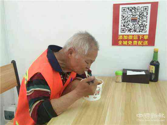 7时30分,在附近打扫卫生的大爷打扫完卫生后,来到米粉店领取了一份免费爱心早餐。他告诉记者,他负责这段道路的清扫,基本上是在这里吃的早餐,时间久了,自己都觉得不好意思,但两个老板总会热情地招呼他领取爱心早餐。