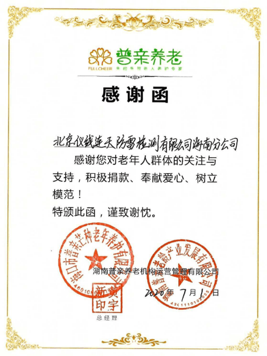 北京仪线连天防雷检测有限公司海南分公司特别策划组织了这次对海南普亲养老院慰问活动,同时开展“防雷知识”讲座,并进行防雷安全隐患排查,用专业安全技能与知识为这些老人送去一份安全保障。通过这次活动,消除了普亲养老院人员的麻痹思想和侥幸心理,将雷电灾害造成的损失降低到最小。