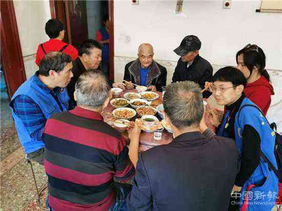 志愿者与刘爷爷一起吃生日宴
