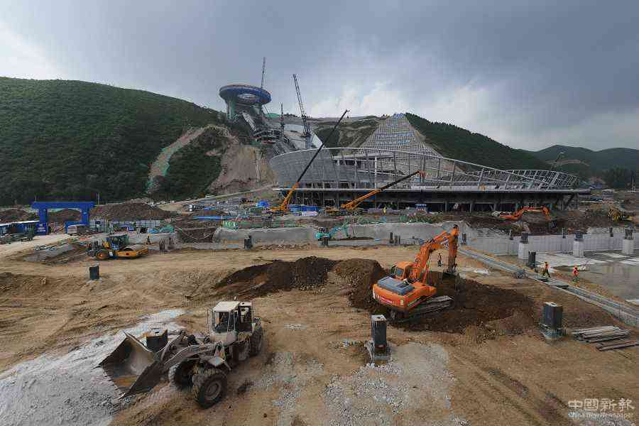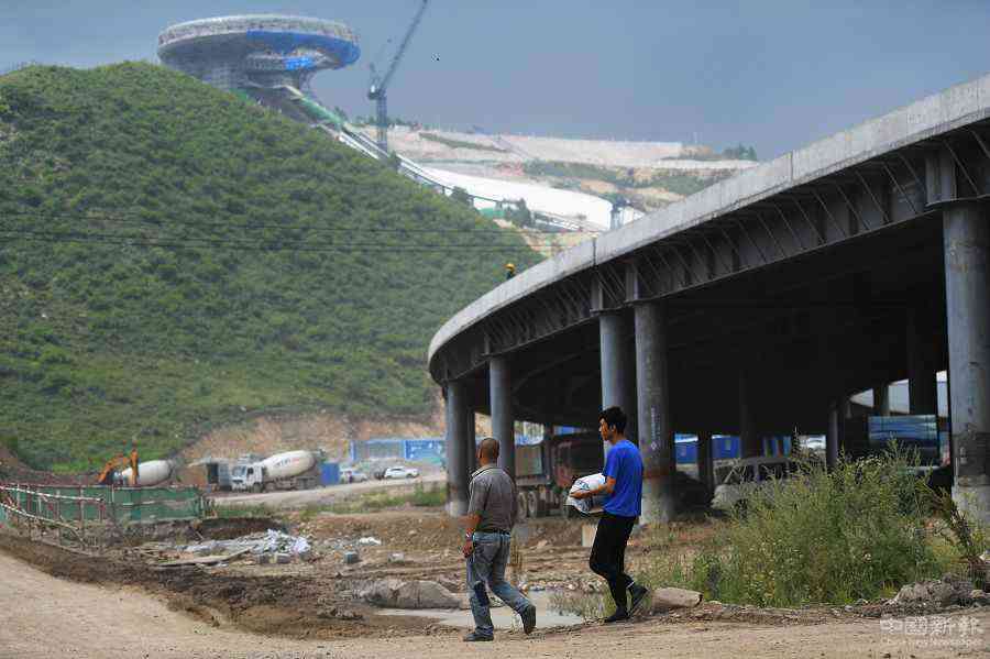 2020年7月30日,张家口崇礼,工人在国家跳台滑雪中心建设工地施工。(中国日报记者 魏晓昊 摄)