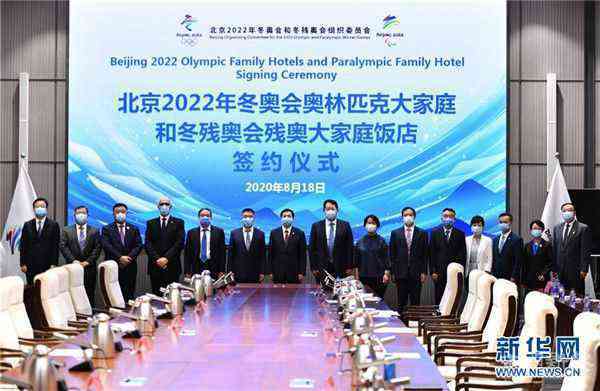 8月18日,嘉宾在签约仪式现场合影。 当日,北京2022年冬奥会和冬残奥会大家庭饭店签约仪式在北京冬奥组委园区举行。 新华社记者 贺长山 摄
