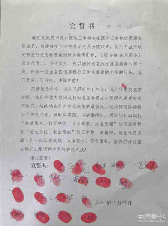 2020年1月24日鼠年除夕,30余名武汉市汉口医院王争艳专家团和王争艳青年志愿者服务队的代表在全国道德模范王争艳的带领下,现场宣誓:将一马当先、冲锋在前、奋战在抗击新型肺炎疫情的第一线.