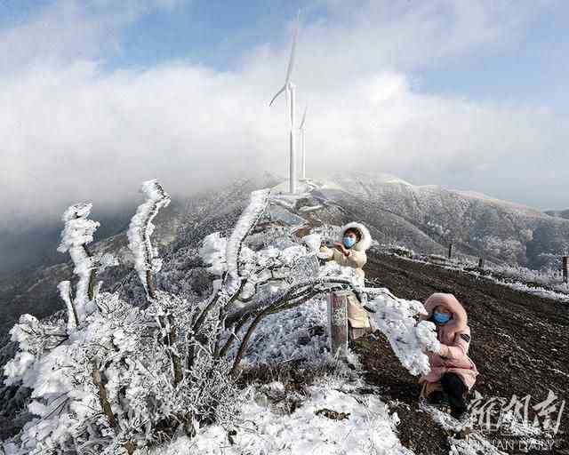 2月16日,游客在赏雪拍照。当天,临武县楚江镇通天山云雾缭绕,山岭披上了银装。玉树琼枝,晶莹剔透,让人仿佛来到了童话世界。 陈卫平 摄