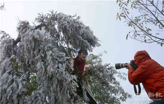 中国新报讯(特约记者 彭林海 通讯员 郑国华 郑远江)近日,冰雪再次降临少数民族高寒山区湖南省新宁县麻林瑶族乡“万字寨”主峰山顶,高寒山区八峒瑶山有南国少有的北国风光,疫情防控后的游客在古树林下赏冰拍照。“万字寨”是我县境内有名的高山,位于西南方向,其苍松翠竹群山环抱,主峰海拔高1613米,近段气候寒冷,树上洁白的冰冻,像冰淇淋一样挂满了枝头。山顶有一寺院,叫“晴岚古寺”,院前有一片千百年来的深山古树群,藤蔓缠树,茂林修竹,曲径通幽,属县级文物保护单位。这里一年四季阳光明媚,鸟语花香,风景绚丽多姿,近年环山水泥路面直通山顶,每天吸引游人、香客前往赏景拍照的络绎不绝。