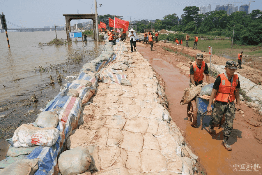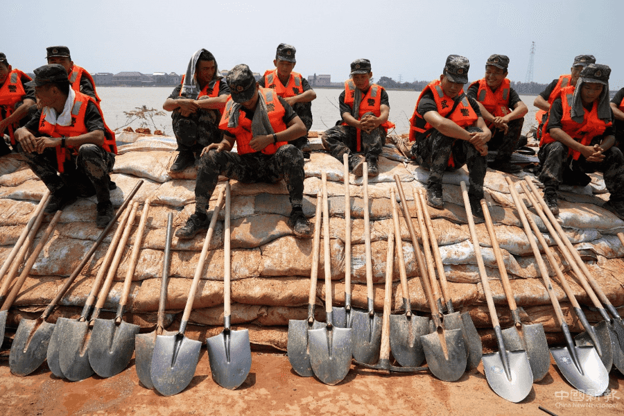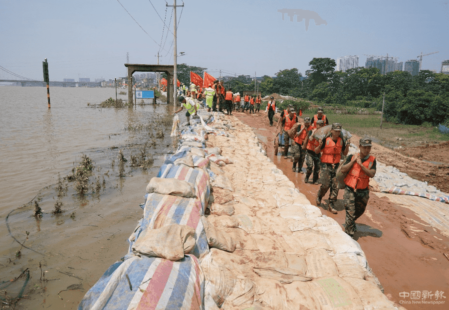 中国日报7月15日鄱阳电(记者 冯永斌)7月15日,江西省鄱阳县昌江江家岭至朱家桥村段大堤上,武警江西总队机动支队官兵顶着炎炎烈日在圩堤内侧搬运砂石,加固堤坝。七月以来,受持续强降雨及上游来水影响,位于鄱阳湖东岸的江西省鄱阳县境内多条河流水位暴涨超警戒线,十余座圩堤出现漫堤决口险情。