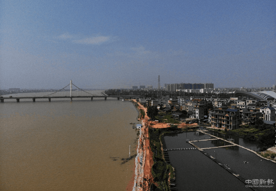 7月15日,航拍江西省鄱阳县昌江江家岭至朱家桥村段大堤。 中国日报记者 冯永斌 摄