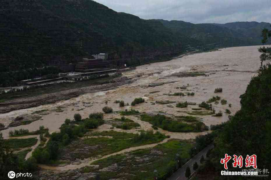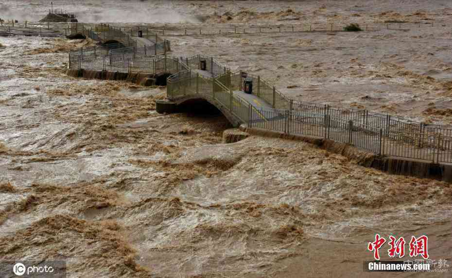 2020年8月18日,山西吉县黄河壶口瀑布景区拍摄的被河水漫过的观景桥。近日,受山陕区间持续暴雨影响,黄河晋陕峡谷水量持续增大,每秒超过2800立方米,壶口景区观景桥及观瀑区域均被淹没,景区已不具备开放条件,壶口景区再次暂时关闭。图片来源:IC-photo