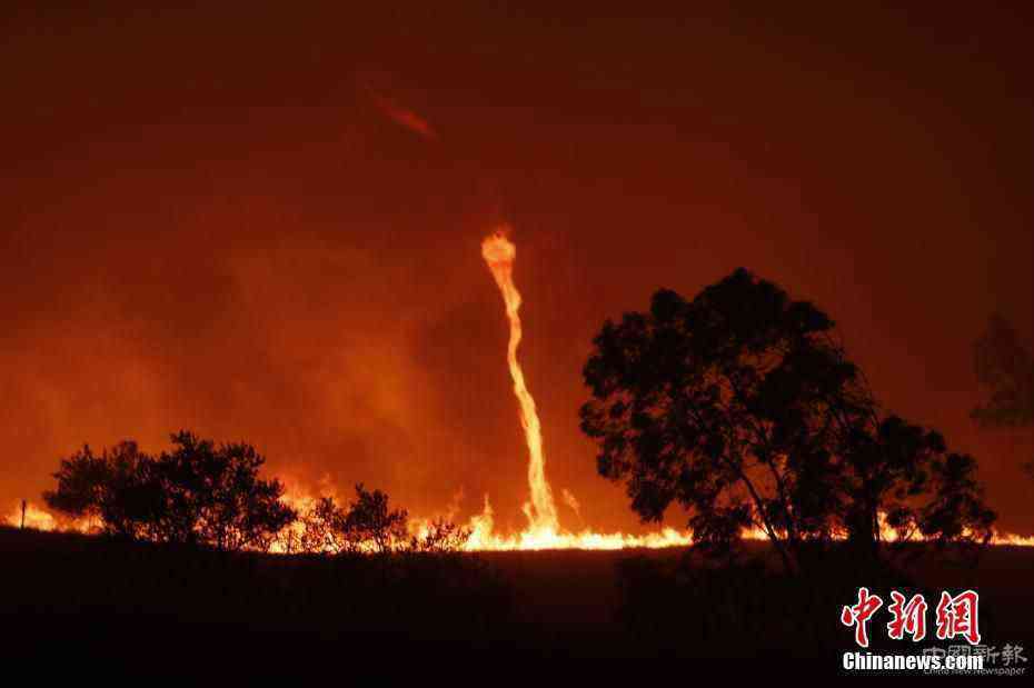当地时间2020年8月19日,美国加利福尼亚州瓦卡维尔,野火蔓延致房屋树木被毁,出现罕见火龙卷现象。图片来源:视觉中国