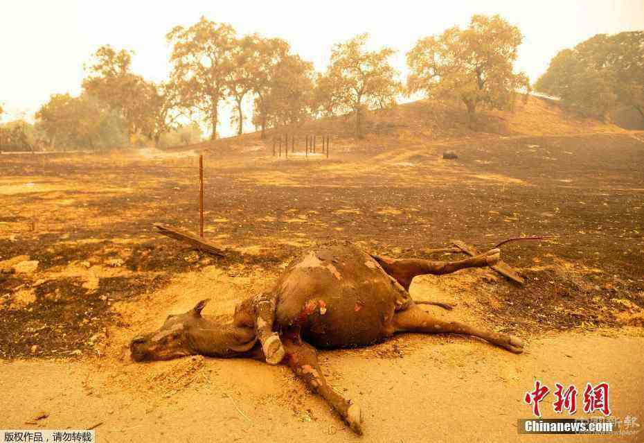 当地时间2020年8月19日,美国加利福尼亚州瓦卡维尔,野火蔓延致房屋树木被毁,出现罕见火龙卷现象。图为动物被山火烧焦。