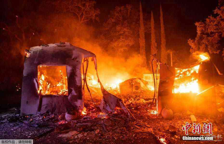 当地时间2020年8月19日,美国加利福尼亚州瓦卡维尔,野火蔓延致房屋树木被毁,出现罕见火龙卷现象。图为野火蔓延致房屋树木被毁。