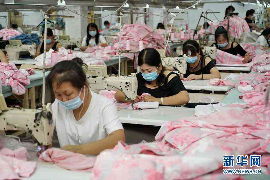 河北省迁安市一家服装外贸企业的工人在生产车间内加工服装(7月13日摄)。