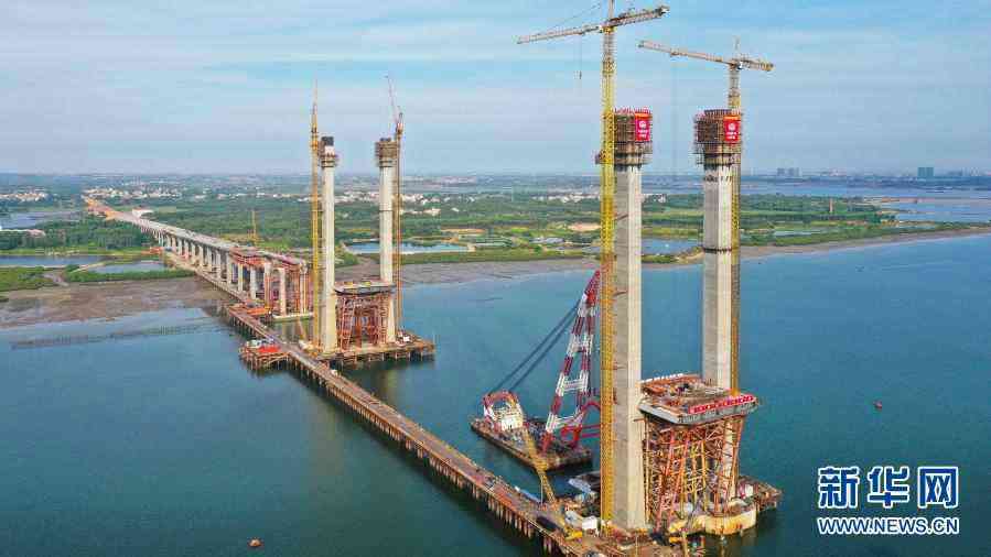 广东湛江调顺跨海大桥完成西主塔(画面右侧)封顶(7月18日摄,无人机照片)。