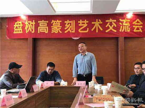 盘树高是湖南省永州市人民检察院的一名普通检察官,工作之余以传承和不懈追求文化自信为乐,一有空就练字和在方寸之间摸索,以古为师,扎根传统,宗法秦汉。他在会上介绍了自己追求篆刻艺术的经过,并赠送了个人篆刻集和金石。与会人员对其篆刻作品进行评析,认为其篆刻作品篆法古朴、章法疏密得体,刀法单双兼备,冲切并行,酣畅淋漓,一气呵成,效果颇佳。其用篆刻艺术来宣传时事政治,善于把传统、现实生活和时事政治相结合,古为今用,具有时代气息和较强的艺术表现力,开创图与文意相融合新风;也是中国最早用篆刻宣传“八荣八耻”等时事政治的篆刻家,《人民日报》于2007年10月11日和2008年8月24日两次刊登其篆刻作品。
