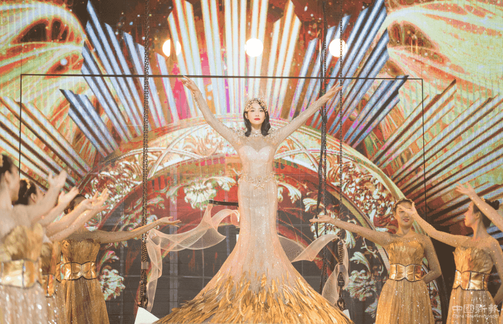 开幕式最后,“金鹰女神”宋茜身穿金色礼服从天而降,特殊的出场方式成为全场焦点。“发光礼服”在设计中融入潮流前沿的科技元素,采用发光面料,以“光芒”为题,用光线勾勒出服装的廓形,描绘出服饰的纹样。这件礼服重达30斤,走路需要4人搀扶。