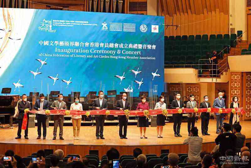 中国文学艺术界联合会香港会员总会(下称:香港文联)昨晚在香港文化中心音乐厅举办成立典礼暨音乐会。香港特别行政区行政长官林郑月娥,中联办副主任卢新宁,特区政府民政事务局局长徐英伟,商务及经济发展局署理局长陈百里,立法会议员、中国文联香港会员总会会长马逢国等出席活动并共同主礼,约千位香港文艺界代表到场参加。\大公报记者 徐小惠 李亚清(文) 马丁(图)
