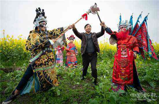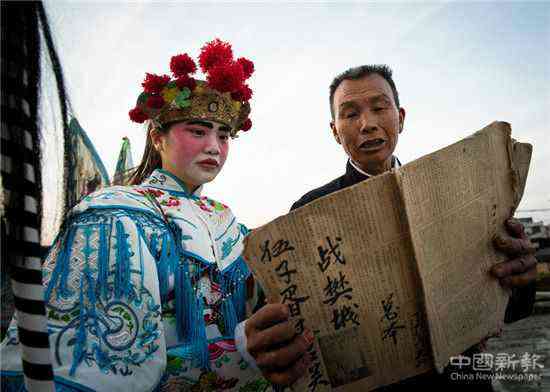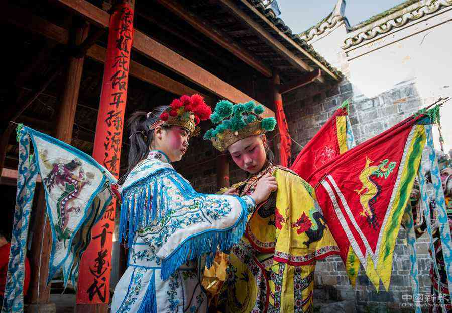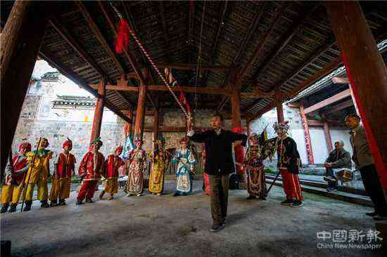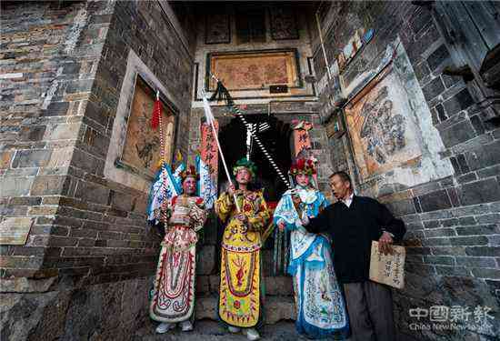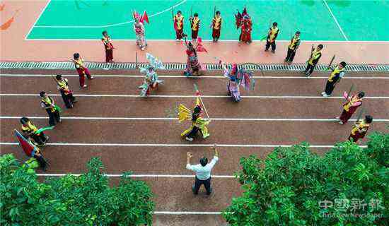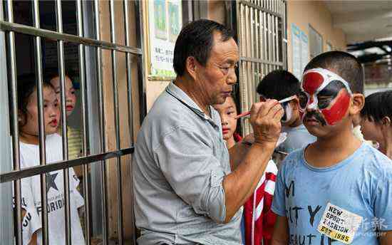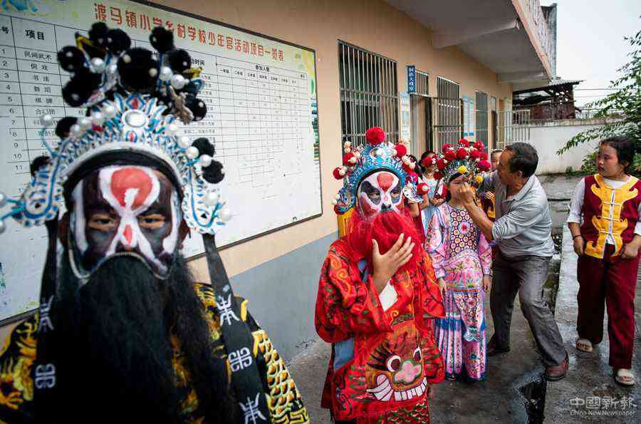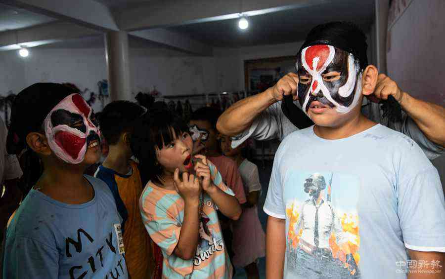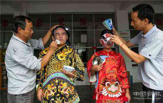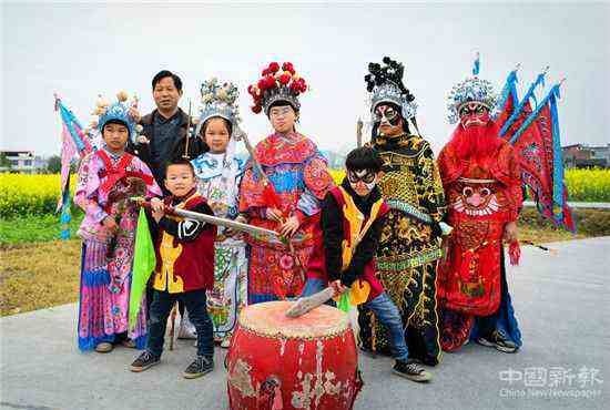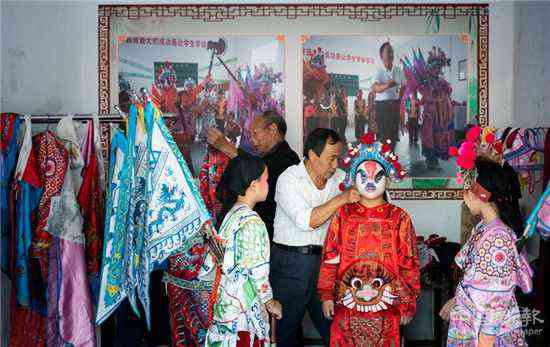 “每逢农闲的周末,我都要召集寨上的十来个小孩学戏。”陈光瞭说,在家祠,他教孩子们吊嗓子、画脸谱、敲锣鼓、拉二胡等基本功,教完基本功后,他再和孩子们一起演练一遍。