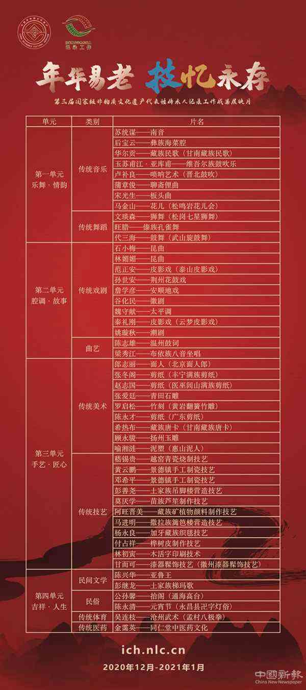 新华网北京12月29日电 12月28日,随着48部非遗纪录片在国家图书馆中国记忆项目中心的非遗展映专区(ich.nlc.cn)正式上线,第三届“年华易老,技·忆永存——国家级非物质文化遗产代表性传承人记录工作成果展映月”拉开帷幕。