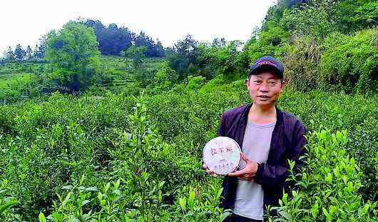 贵州石阡县坪山乡大坪村村民王元兵在自家茶园内展示红茶饼。(受访者供图)