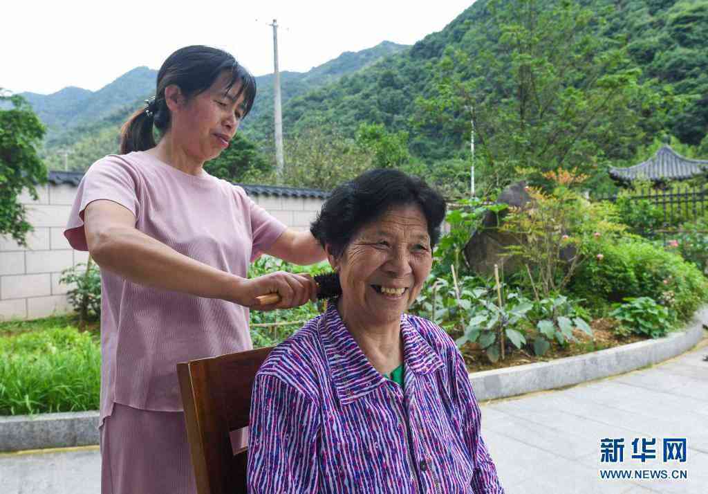 5月24日,永昌镇唐昌村村民方芽娟在给74岁的婆婆闻菊芽梳头,她家是村里家庭和睦的典范。