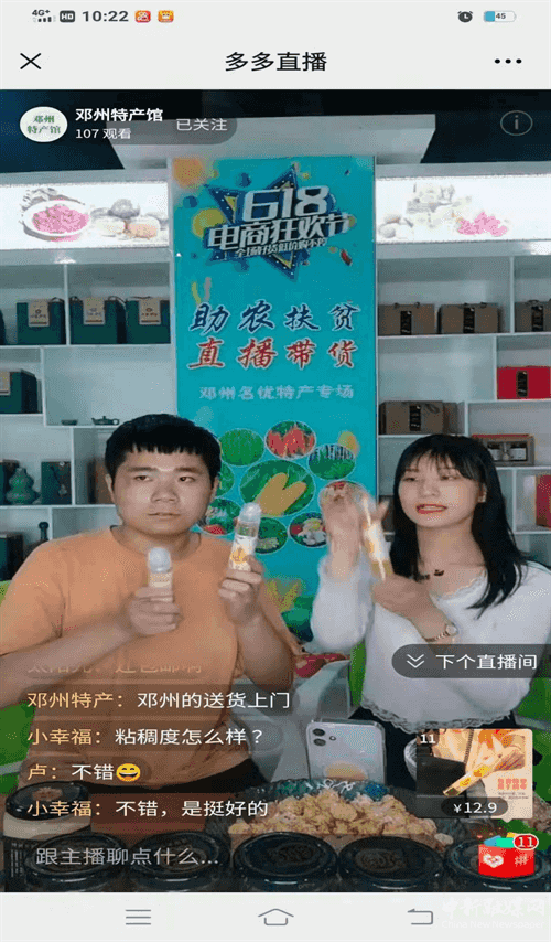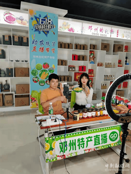邓州小磨油、邓州黄酒、邓州糊辣汤、元妙观扒素鸡、邓州窝子面、天然成熟蜂蜜、新鲜绿甘蓝系列土货……6月18日,以“助农扶贫·直播带货”为主题的6·18 电商购物狂欢节河南邓州名优特产直播专场在邓州市电子商务服务中心举行,积极推动产销对接,促进消费潜能释放、发展新型消费业态、繁荣消费市场,呈现出乡村振兴别样的“风景”。