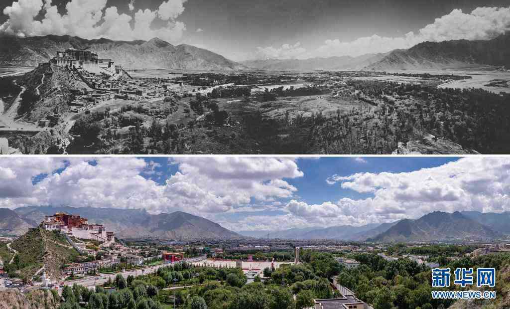拼版照片:上图是20世纪50年代拍摄的拉萨市景象(新华社发 蓝志贵摄);下图是2021年8月13日拍摄的拉萨市新貌(接片,新华社记者孙瑞博摄)。