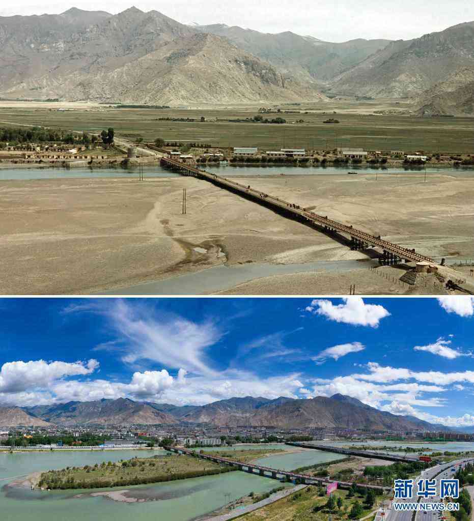 拼版照片:上图是20世纪50年代的拉萨大桥(新华社记者王纯德摄);下图是2021年8月9日拍摄的拉萨大桥新貌(新华社记者孙非摄,无人机照片)。新华社发