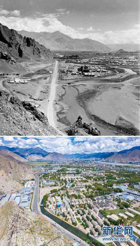拼版照片:上图是20世纪60年代拍摄的拉萨市西郊景象(新华社发 蓝志贵摄);下图是2021年8月9日拍摄的拉萨市西郊新貌(新华社记者普布扎西摄,无人机照片)。新华社发