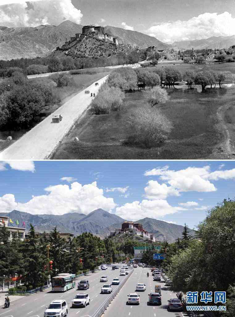 拼版照片:上图是20世纪50年代,汽车通过市郊公路开往布达拉宫方向(新华社记者任用昭摄);下图是2021年8月9日,车辆穿行在通往布达拉宫的大路上(新华社记者张汝锋摄)。新华社发