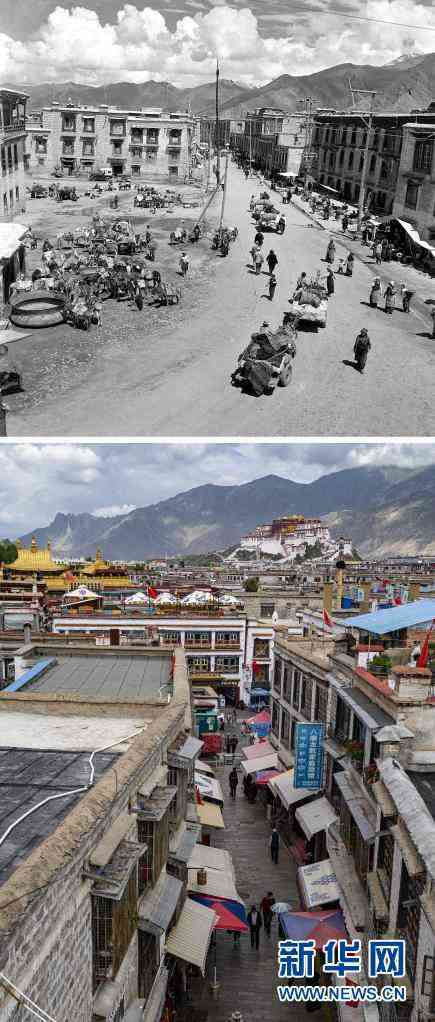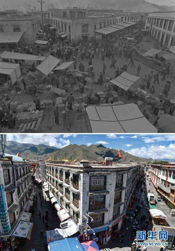 拼版照片:上图是20世纪50年代的拉萨市八廓街(新华社记者王纯德摄);下图是2021年8月13日拍摄的拉萨市八廓街(新华社记者觉果摄)。新华社发