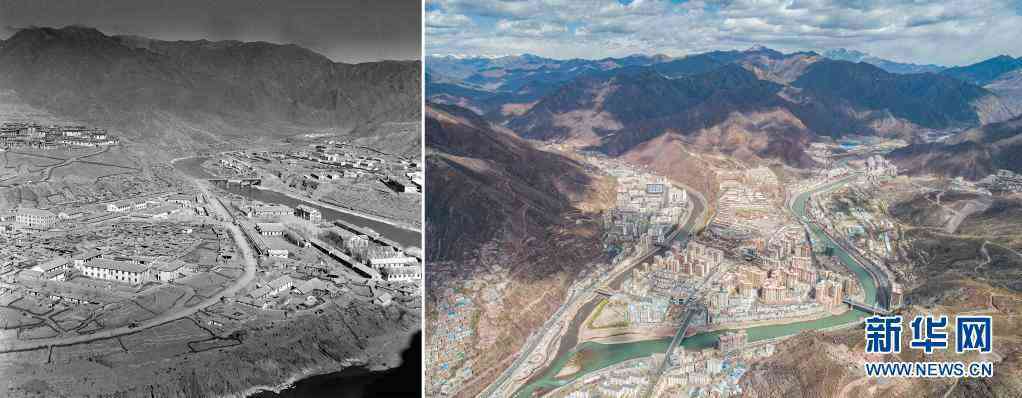 拼版照片:左图是20世纪60年代的昌都市区一角(新华社记者任用昭摄);右图是2021年3月25日拍摄的昌都市卡若区(新华社记者孙非摄,无人机照片)。新华社发