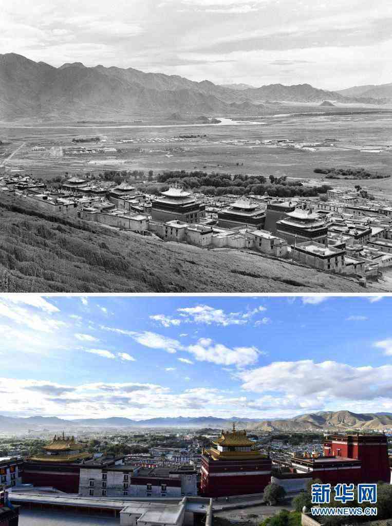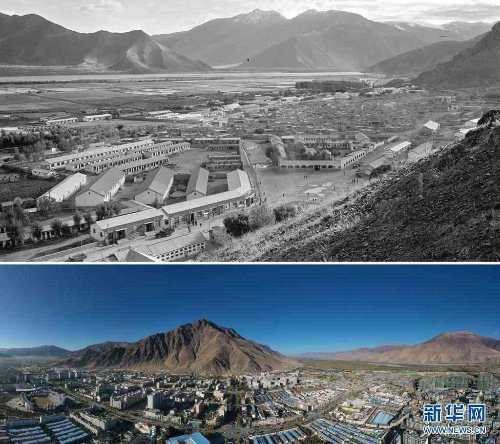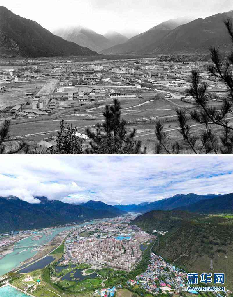 拼版照片:上图是20世纪70年代的西藏山南地区泽当镇景象(新华社记者顾绶康摄);下图是2020年11月26日拍摄的山南泽当镇风貌(新华社发 次仁龙布摄,无人机照片)。新华社发