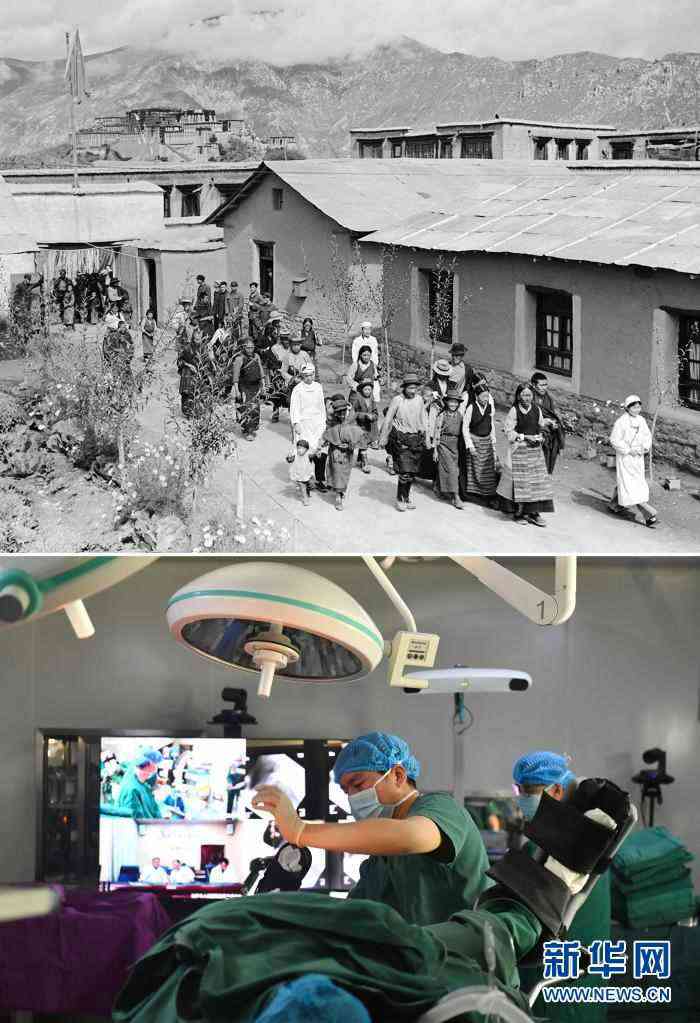 拼版照片:上图是20世纪50年代,前往拉萨市人民医院看病的藏族群众在护士陪同下到医疗室去就诊(新华社记者任用昭摄);下图是2021年4月19日,拉萨市人民医院骨科医生通过5G通信技术,在北京积水潭医院专家远程指导下使用骨科机器人开展手术(新华社记者孙瑞博摄)。新华社发