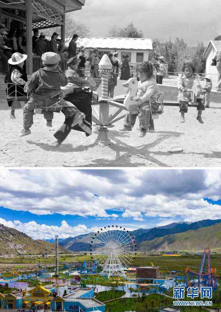 拼版照片:上图是20世纪80年代,日喀则幼儿园的孩子们在玩动物圆盘转椅(新华社记者程曦摄);下图是2021年8月9日拍摄的拉萨市象雄美朵游乐园(新华社记者张汝锋摄,无人机照片)。新华社发