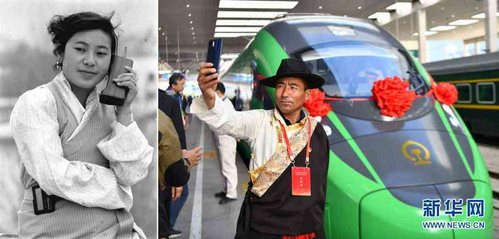 拼版照片:左图是1994年,腰挂BP机、手持“大哥大”的藏族女商人拉珍和四川的客户洽谈生意(新华社记者土登摄);右图是2021年6月25日,乘客与西藏首条电气化铁路拉林铁路上的复兴号列车自拍合影(新华社记者晋美多吉摄)。新华社发