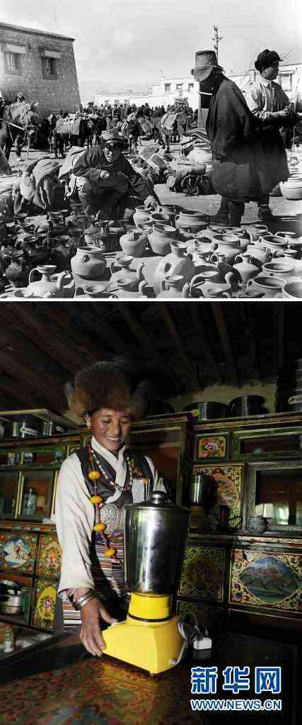 拼版照片:上图是20世纪50年代,拉萨居民购买酥油茶壶(新华社记者任用昭摄);下图是2011年12月12日,西藏日喀则拉孜县吉角村村民仓决用电动酥油茶搅拌机给家人打酥油茶(新华社记者普布扎西摄)。新华社发