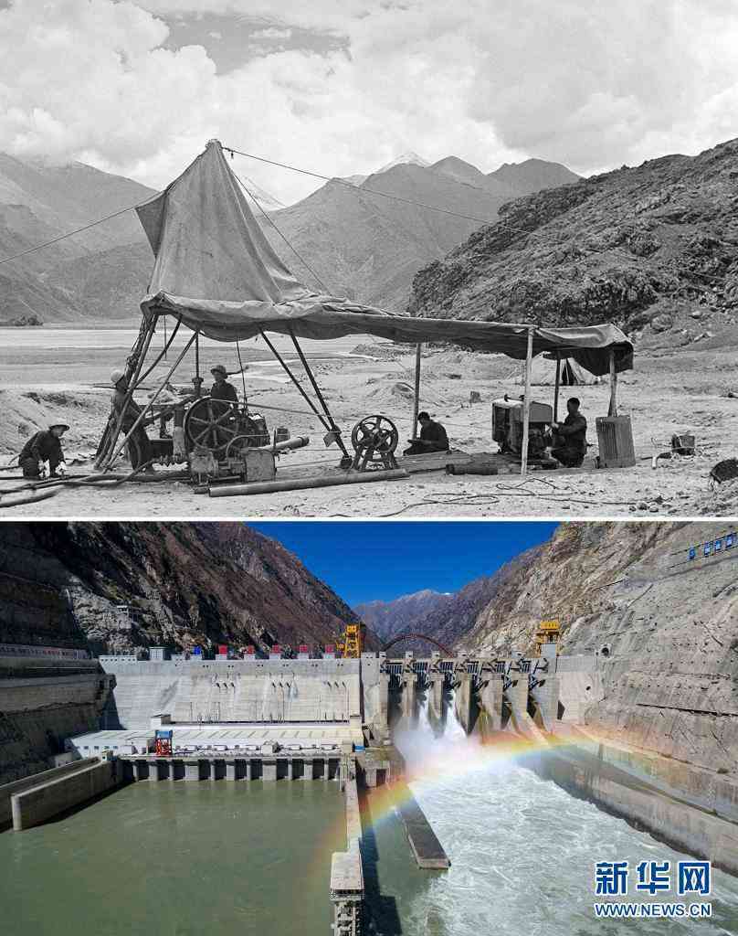 拼版照片:上图是20世纪50年代,西藏工程勘察队钻探组在选定的拉萨水力发电厂厂址,用从东北鸡西矿务局机械总厂运来的钻探机进行钻探(新华社记者任用昭摄);下图是2018年10月26日拍摄的西藏首座大型水电站——藏木水电站(新华社发 董志雄摄)。新华社发
