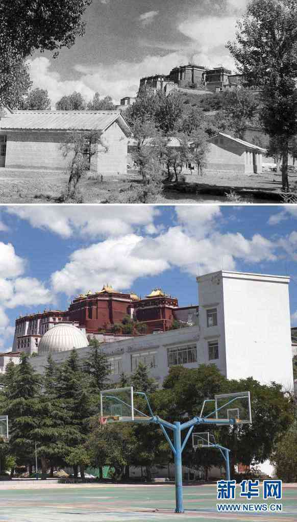 拼版照片:上图是20世纪50年代拍摄的西藏第一所现代正规初级中学——拉萨中学一角(新华社记者景家栋摄);下图是2021年8月9日拍摄的拉萨中学一角(新华社记者孙瑞博摄)。新华社发