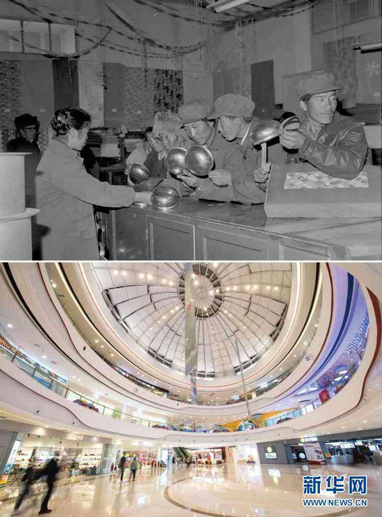 拼版照片:上图是20世纪80年代,人们在拉萨一家商店购物(新华社发 刘丽嘉摄);下图是2021年8月15日,人们在拉萨市万达广场购物(新华社记者孙非摄)。新华社发