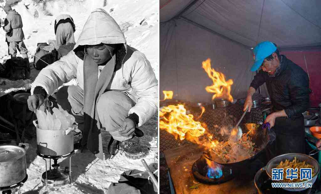 拼版照片:左图是20世纪60年代,我国登山队员在海拔5700米冰川上宿营时融冰煮饭(新华社记者陈宗烈摄);右图是2020年5月10日,厨师在海拔6500米的前进营地炒菜(新华社记者孙非摄)。新华社发