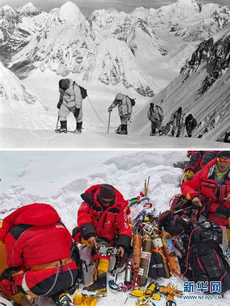 拼版照片:上图是1960年,登山队队员在海拔7000米以上的雪坡上前进(资料照片);下图是2020年5月21日拍摄的2020珠峰高程测量登山队员所使用的现代登山设备(新华社特约记者拉巴摄)。新华社发