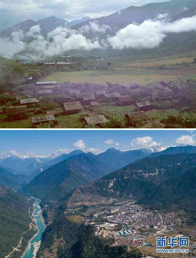 拼版照片:上图是20世纪80年代的墨脱县景色(新华社记者才龙摄);下图是2021年2月13日拍摄的墨脱县风光(新华社记者孙非摄,无人机照片)。新华社发