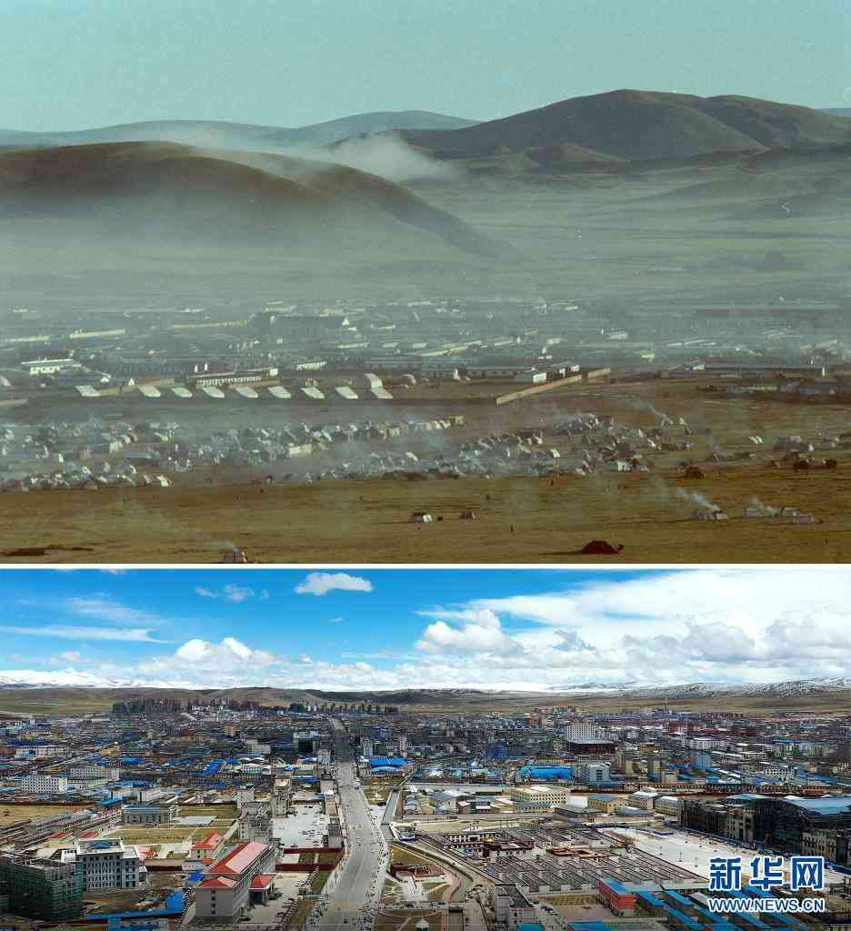 拼版照片:上图是20世纪80年代的西藏那曲地区行署所在地那曲镇(新华社记者袁克忠摄);下图是那曲市市区风貌(新华社发 普布扎西摄,无人机视频截图)。新华社发
