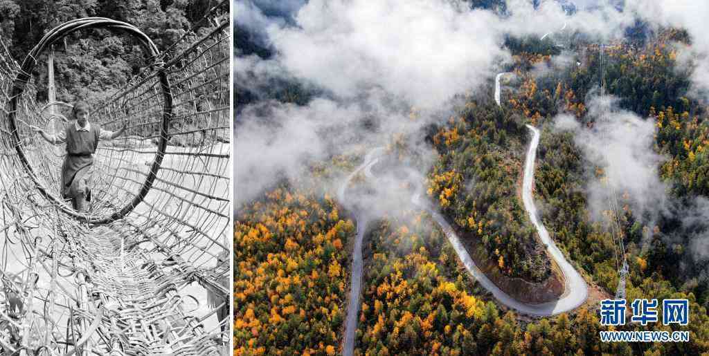 拼版照片:左图是墨脱县雅鲁藏布江上的籐桥(20世纪80年代资料照片,新华社记者顾绶康摄);右图是2020年11月5日拍摄的派墨公路米林段公路(新华社发 董志雄摄)。新华社发