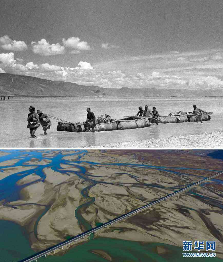 拼版照片:上图是20世纪50年代,雅鲁藏布江上游的牛皮船载着土特产和粮食沿江运输至西藏东部(新华社发 赵奇摄);下图是2016年12月11日拍摄的位于西藏山南市扎囊县境内的扎囊特大桥(新华社记者普布扎西摄)。新华社发