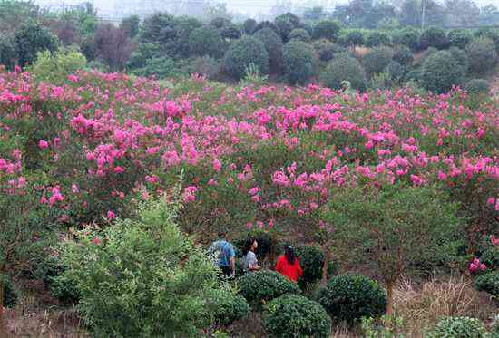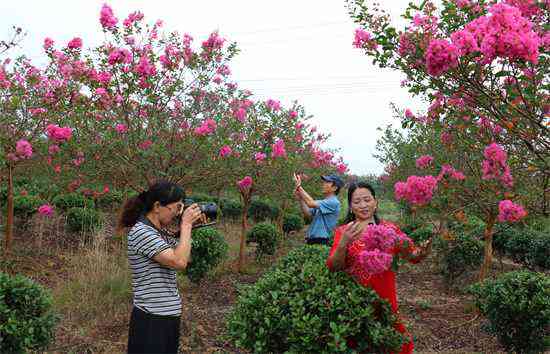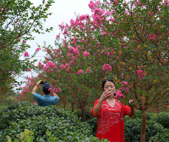 2021年9月2日,安徽省合肥市庐江县郭河镇郭河社区千株紫薇花开正红,姹紫嫣红的花带与橙黄橘绿的田野,织就成一幅大美的田园画卷,引来不少居民和游客前来拍照留念,观花赏景。