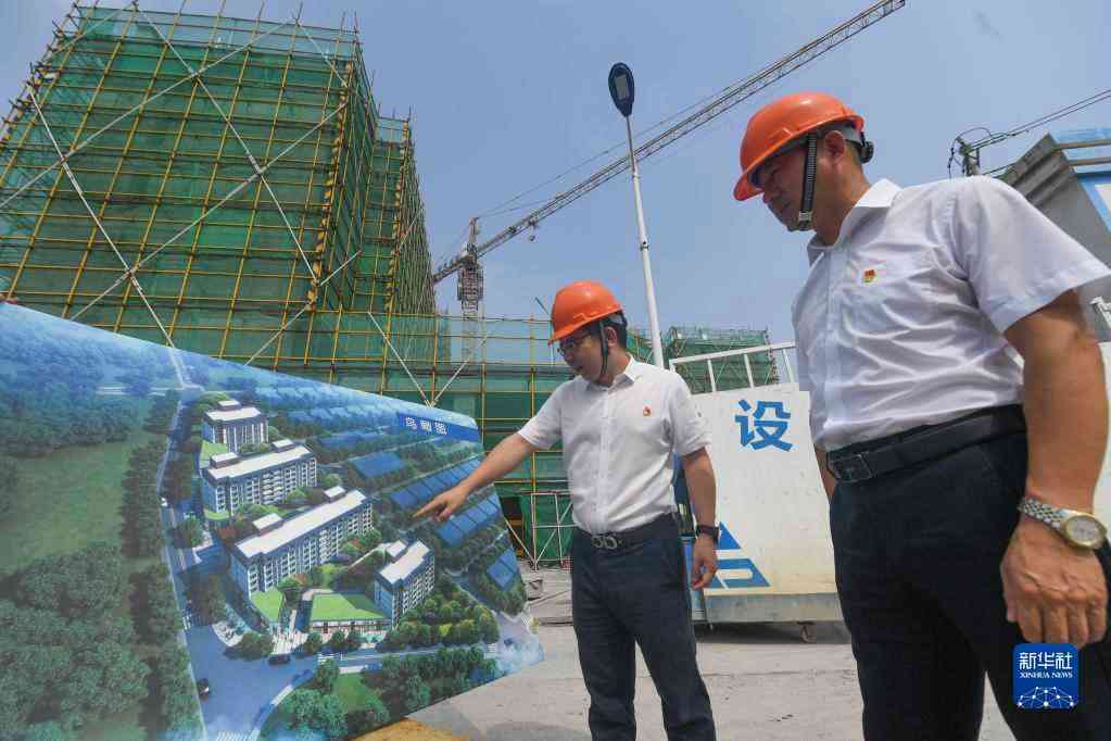 9月6日,杭州市富阳区东洲街道建华村的第一书记彭史丰(左)在公租房项目场地查看工程进度。建华村通过第一书记的帮带整转,进一步清算村级自然资源和固定资源,通过合作共建、土地流转等方式,招引公租房、停车场等项目,村集体经济收入从原来的30多万元提升到400多万元。